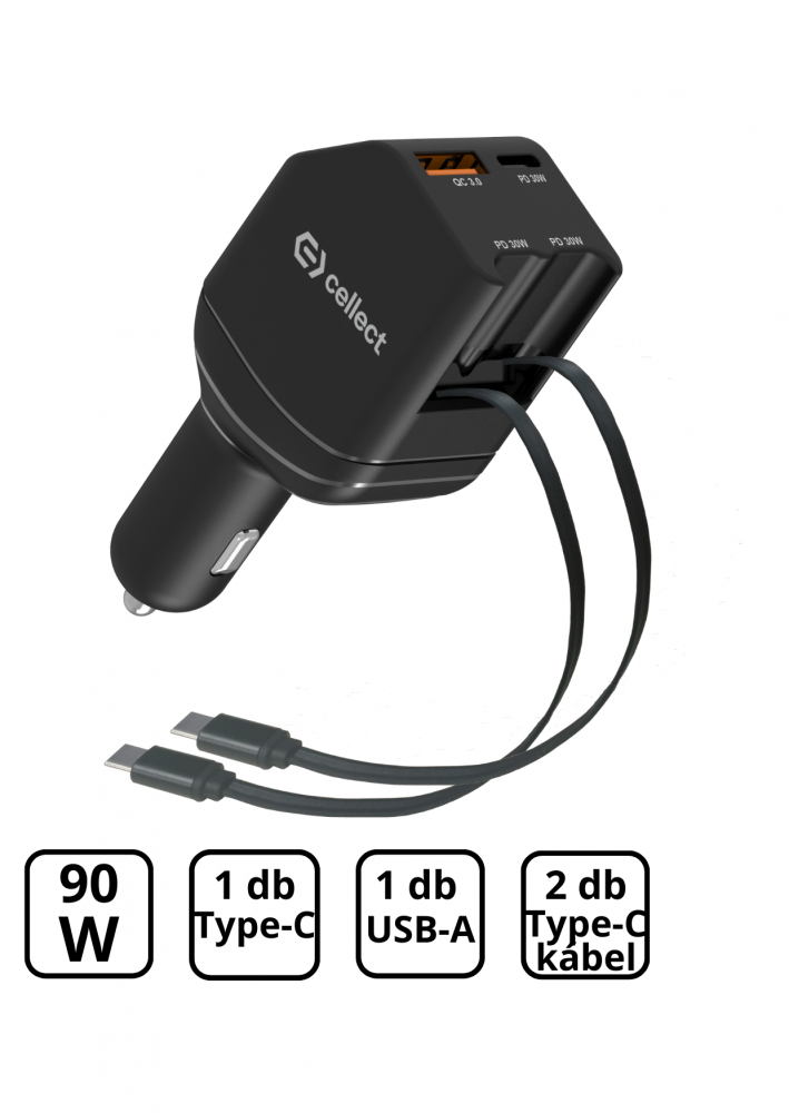 Autós töltő 2 db beépített kábellel gyorstöltéssel 90W,Fekete